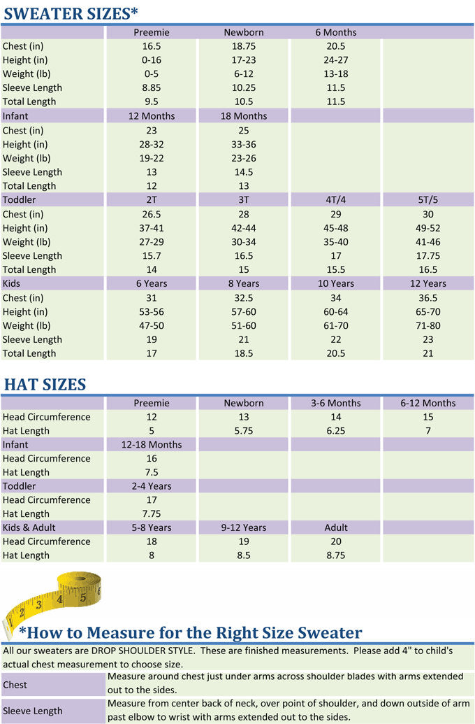 Available Sizes: Preemie, Newborn, 3-6 mos, 6-12 mos, 12-18 mos, Ages 2 to 4, Ages 5 to 8, Ages 9 to 12 Adult size is $5.00 more. See our Adult Knits Section. BE SURE TO INCLUDE SIZE, NAME AND NAME COLOR WHEN ORDERING. YOU CAN ENTER THIS INFORMATION IN THE NOTES SECTION.