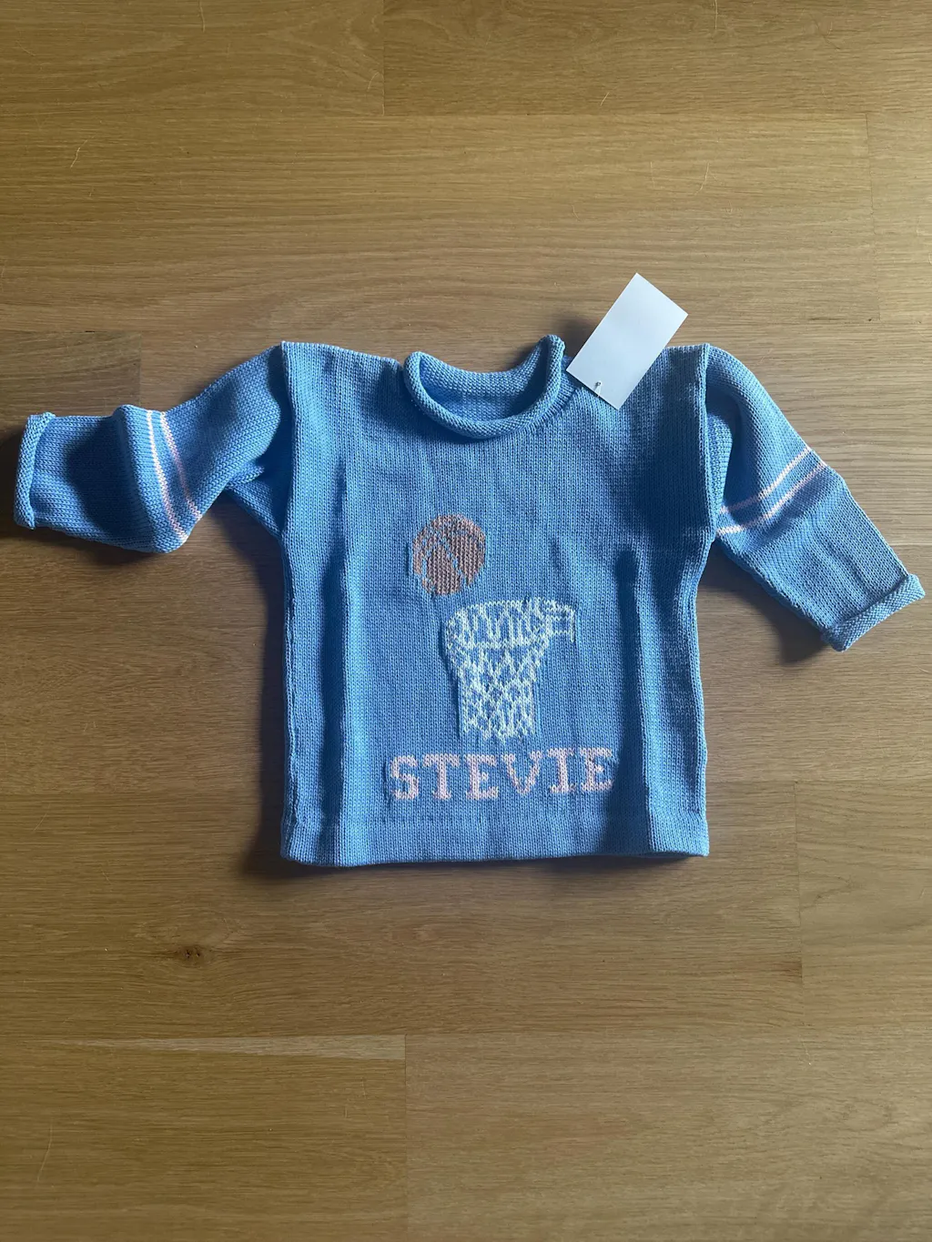 The basketball varsity sweater has a basketball motif on the front and the child's number and name on the back. Stripes on the sleeves complete the varsity theme.